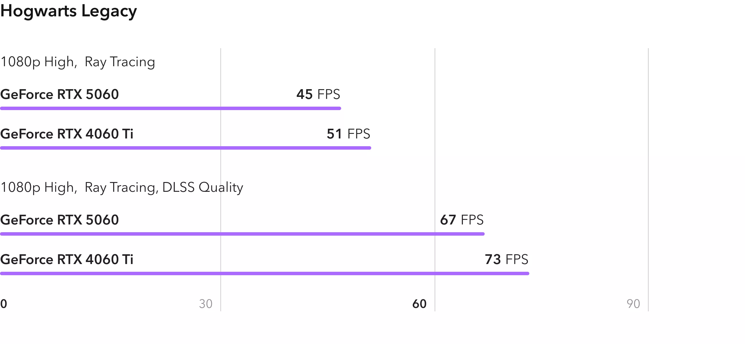 Hogwarts Legacy отдает предпочтение старой видеокарте. RTX 4060 Ti показывает более 50 FPS в среднем, что на 13% выше, чем у RTX 5060. Вы скорее всего активируете DLSS, а в этом случае новая архитектура позволит новинке сократить отставание до 9%.