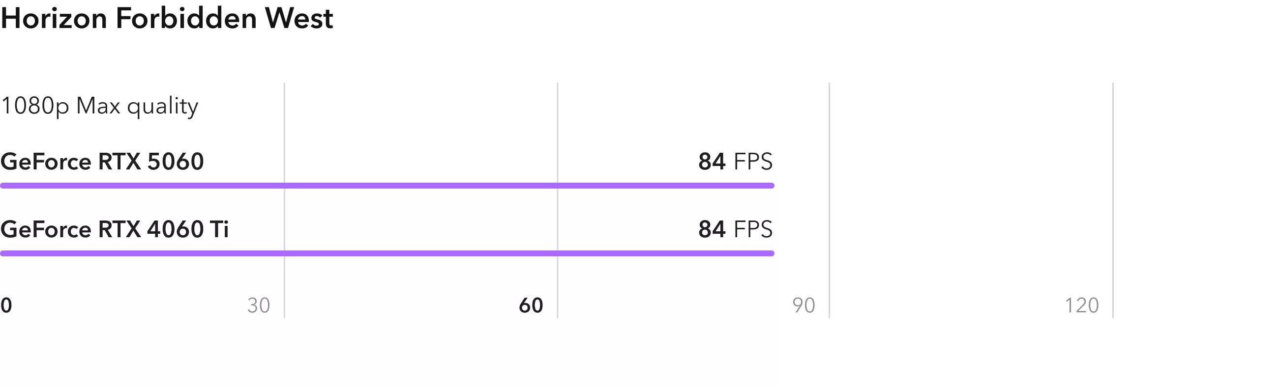 В Horizon Forbidden West RTX 5060 показывает идентичные результаты с RTX 4060 Ti. В среднем они набирают 84 FPS. И даже если изучить минимальные показатели, то разницы также не будет, 55 кадров в секунду.