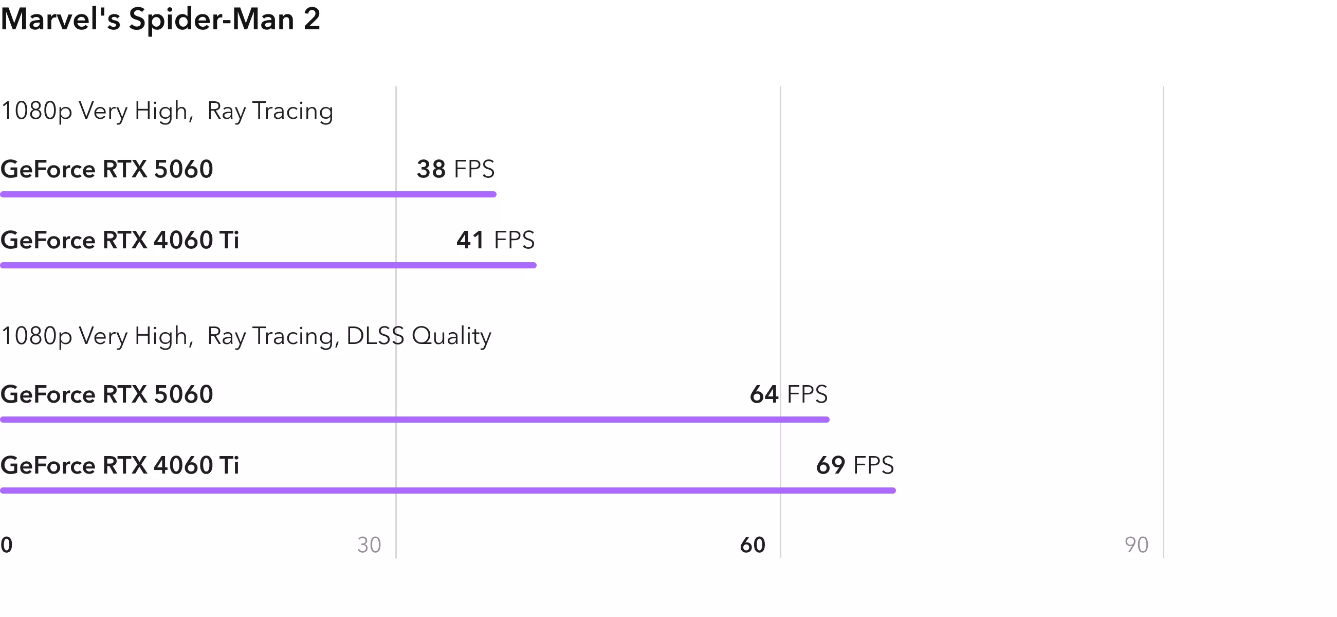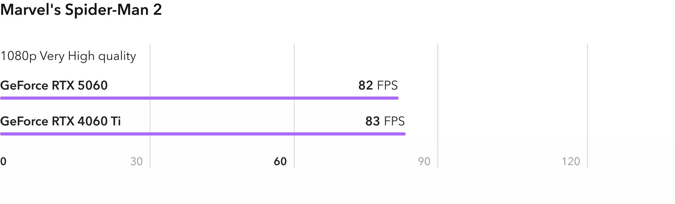 В Marvels Spider-Man 2 вы снова не заметите отличий в производительности видеокарт. Средний результат составит 82-83 кадра в секунду. В разрешении 2К отличия будут более заметны. RTX 4060 Ti показывает 56 FPS, а RTX 5060 - 52. Активация генератора кадров с максимальным множителем полностью поменяет расклад, у новинки будет 180 кадров в секунду, а RTX 4060 Ti набирает немногим более 100.