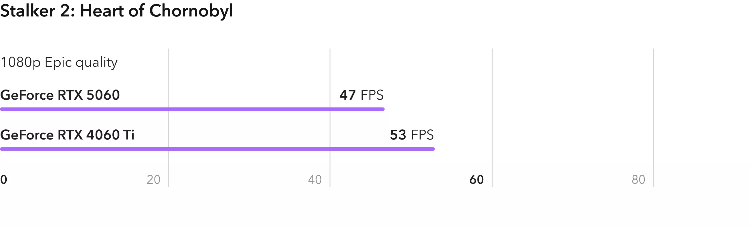 В Stalker 2 наибольшую роль играет количество вычислительных блоков, поэтому RTX 4060 Ti имеет заметное преимущество, опережая новинку на 13%. В любом случае для плавной игры на рассматриваемых видеокартах потребуется апскейлер DLSS, чтобы поднять FPS до значений выше 60. При этом отрыв сократится примерно до 10%.