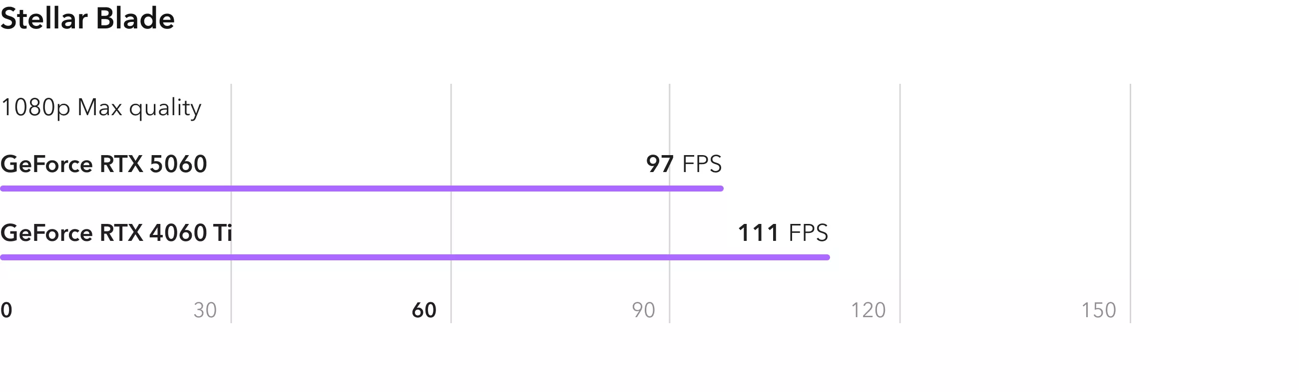 В Stellar Blade новая карта опять немного отстает, показывая 97 FPS в среднем, что на 12% меньше, чем у RTX 4060 Ti. Тем не менее, производительности в Full HD более чем достаточно. При переходе к 2К ситуация остается вполне комфортной: даже в этом разрешении вы сможете рассчитывать на более 60 FPS, причём без использования апскейлеров - в честном рендере. Этого вполне достаточно, чтобы насладиться одной из лучших игр жанра Hack and Slash.