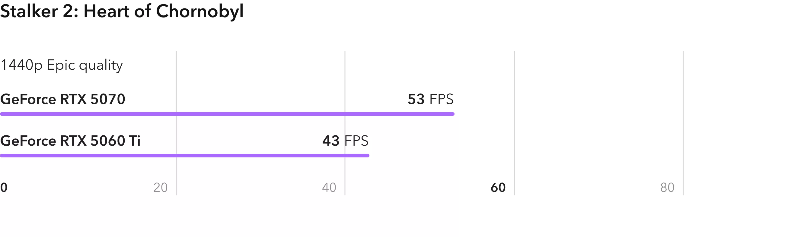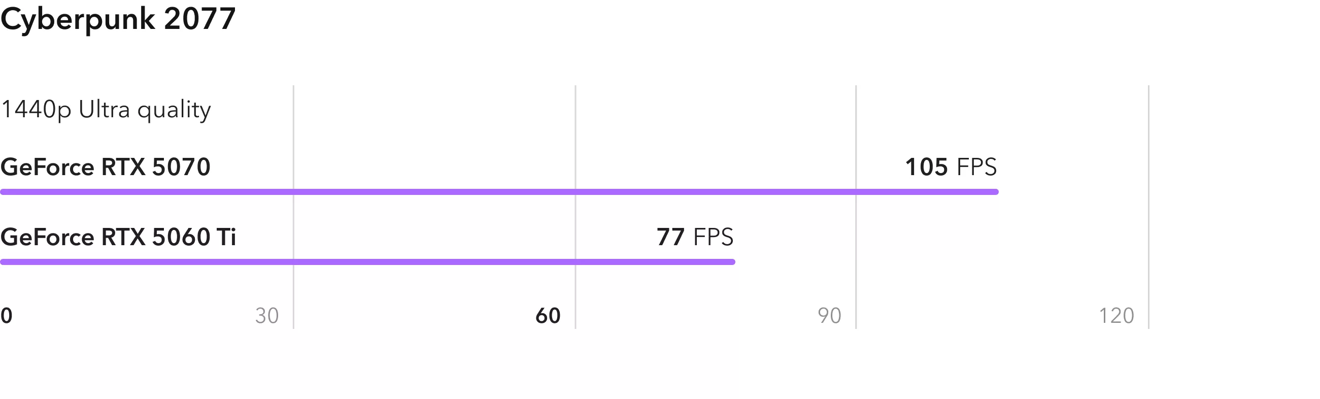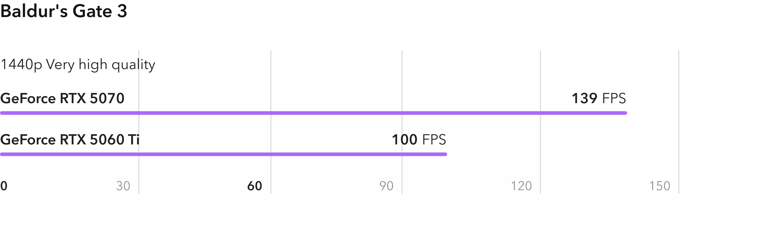 Ролевая игра Baldurs Gate 3 неплохо оптимизирована и показывает реальное различие в вычислительной мощности видеокарт. RTX 5070 опережает младшую модель на 40%. При этом RTX 5060 Ti также справляется с игрой, выдавая в среднем 100 FPS.