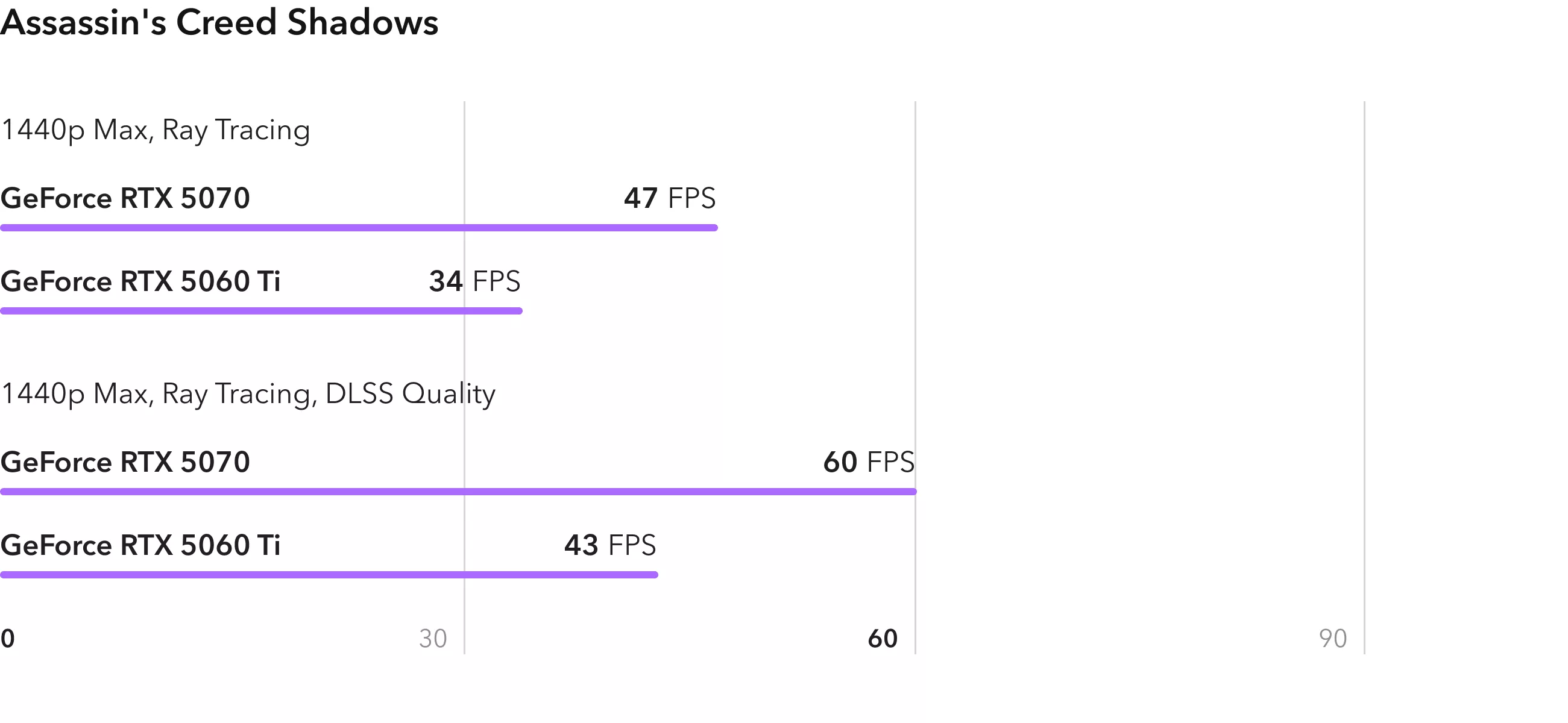 Игра Assassins Creed Shadows имеет высокие системные требования, так как следуя трендам перешла на расчет освещения с использованием RT ядер. RTX 5070 в разрешении 2К позволяет получить относительно комфортные 47 FPS, а с апскейлером DLSS уже 60. RTX 5060 Ti имеет заметное отставание, которое достигает 30%, что соответствует разнице в количестве шейдерных ядер.