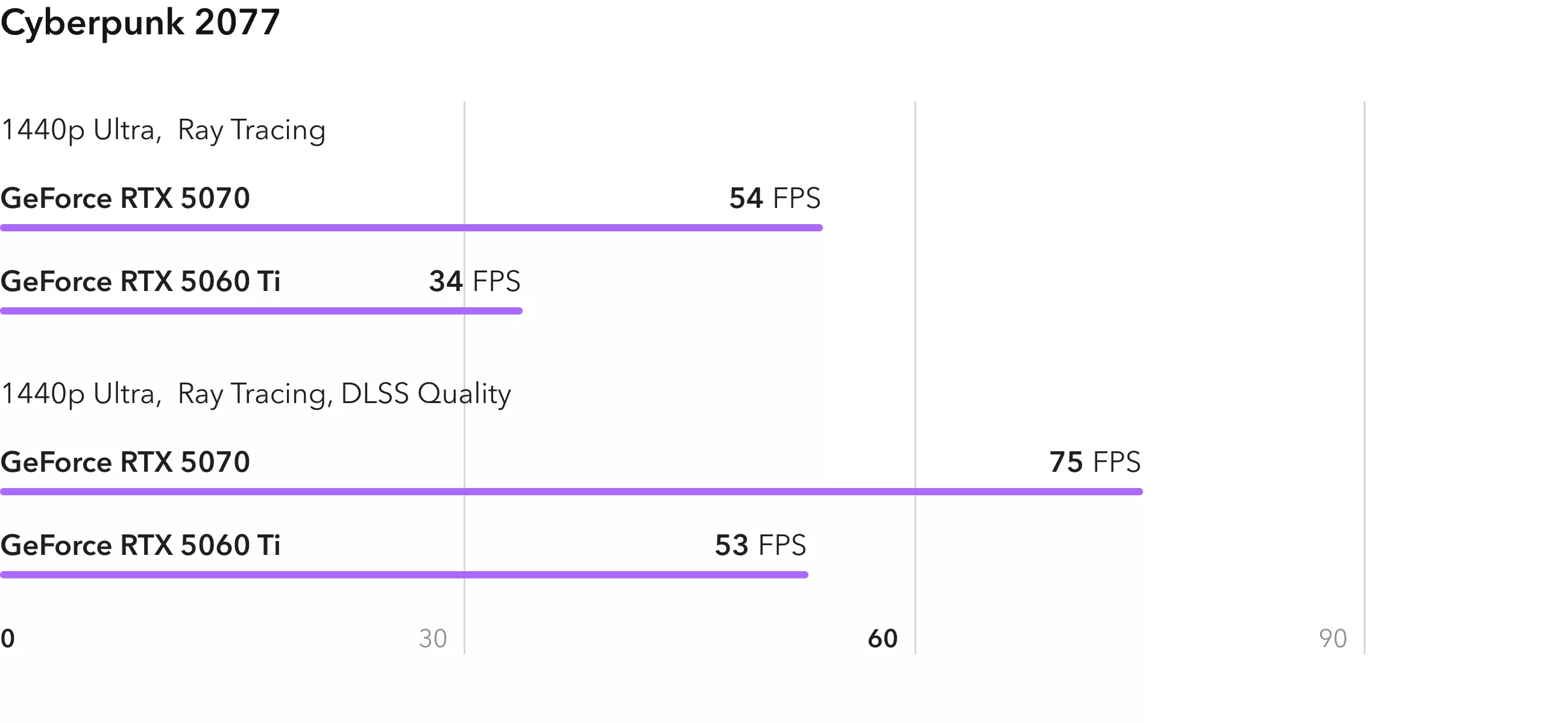 Cyberpunk 2077 с трассировкой лучей и видеокартой RTX 5070 покажет в среднем 54 кадра в секунду, а после активации DLSS будет более 70 FPS. RTX 5060 Ti не столь пригодна для этого режима, для плавной картинки придется ставить DLSS в пресет "Баланс".