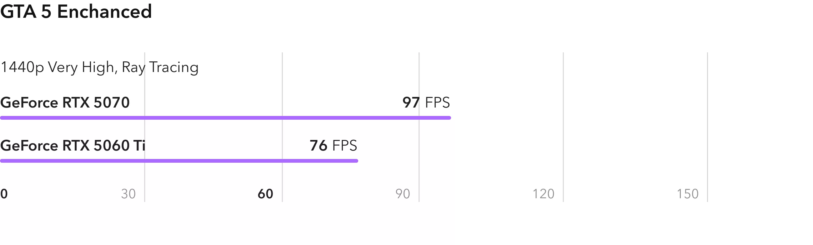 GTA 5 с трассировкой лучей имеет физически корректные тени и правильные отражения, при этом требования к видеокарте нельзя назвать завышенными. В честном разрешении 2К вы можете рассчитывать на 76 FPS на младшей RTX 5060 Ti. RTX 5070 будет быстрее примерно на 30%.