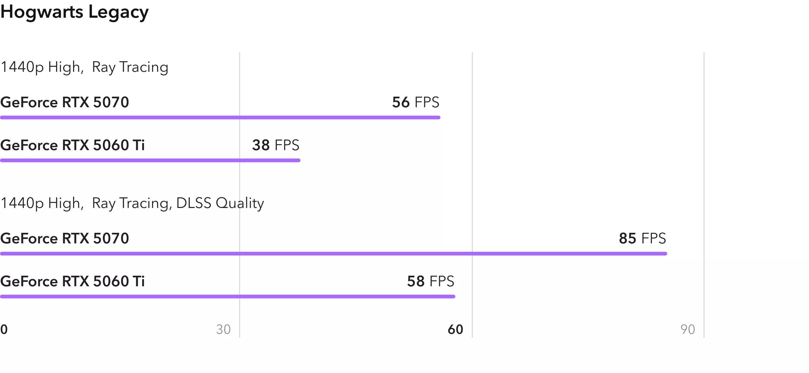 Посетить замок Хогвартс с трассировкой лучей в разрешении 1440p можно с видеокартой RTX 5060 Ti, но для плавной картинки при 58 FPS будет необходим апскейлер DLSS. RTX 5070 показывает такой результат в честном 2К без масштабирования, а при одинаковых настройках превосходит младшую модель на 47%.