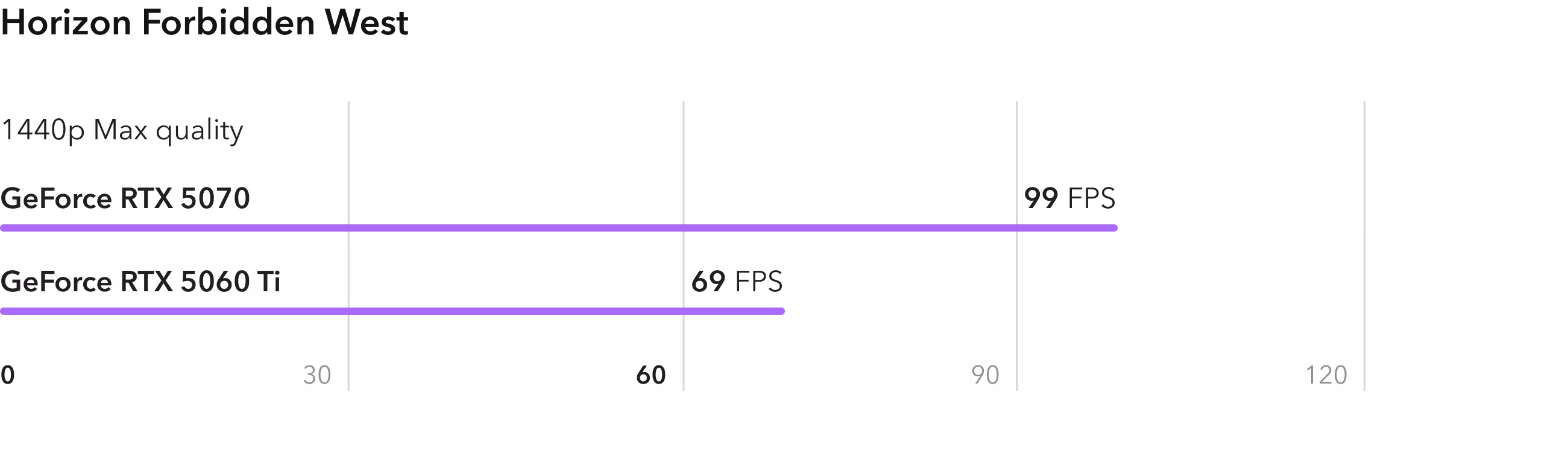 Horizon Forbidden West интересна не только своими масштабными мирами, населенными зверями-роботами, но еще и тем, что игра имеет отличную масштабируемость производительности. RTX 5060 Ti показывает 69 кадров в секунду, а RTX 5070 – 99, что на 43% больше.