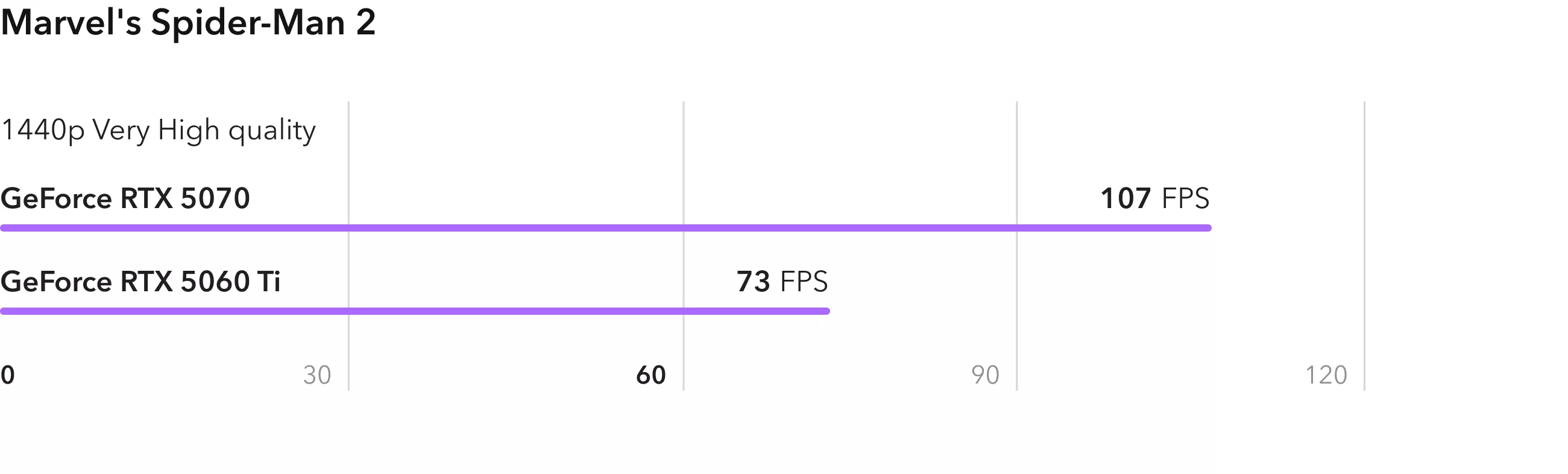 Игра Marvels Spider-Man 2 хорошо откликается не только на производительность GPU, но еще и на пропускную способность видеопамяти. С учетом того, что RTX 5070 имеет на треть больше вычислительных блоков, а шина памяти шире в полтора раза, игра показывает внушительные 107 FPS, что почти на 45% больше, чем у RTX 5060 Ti.