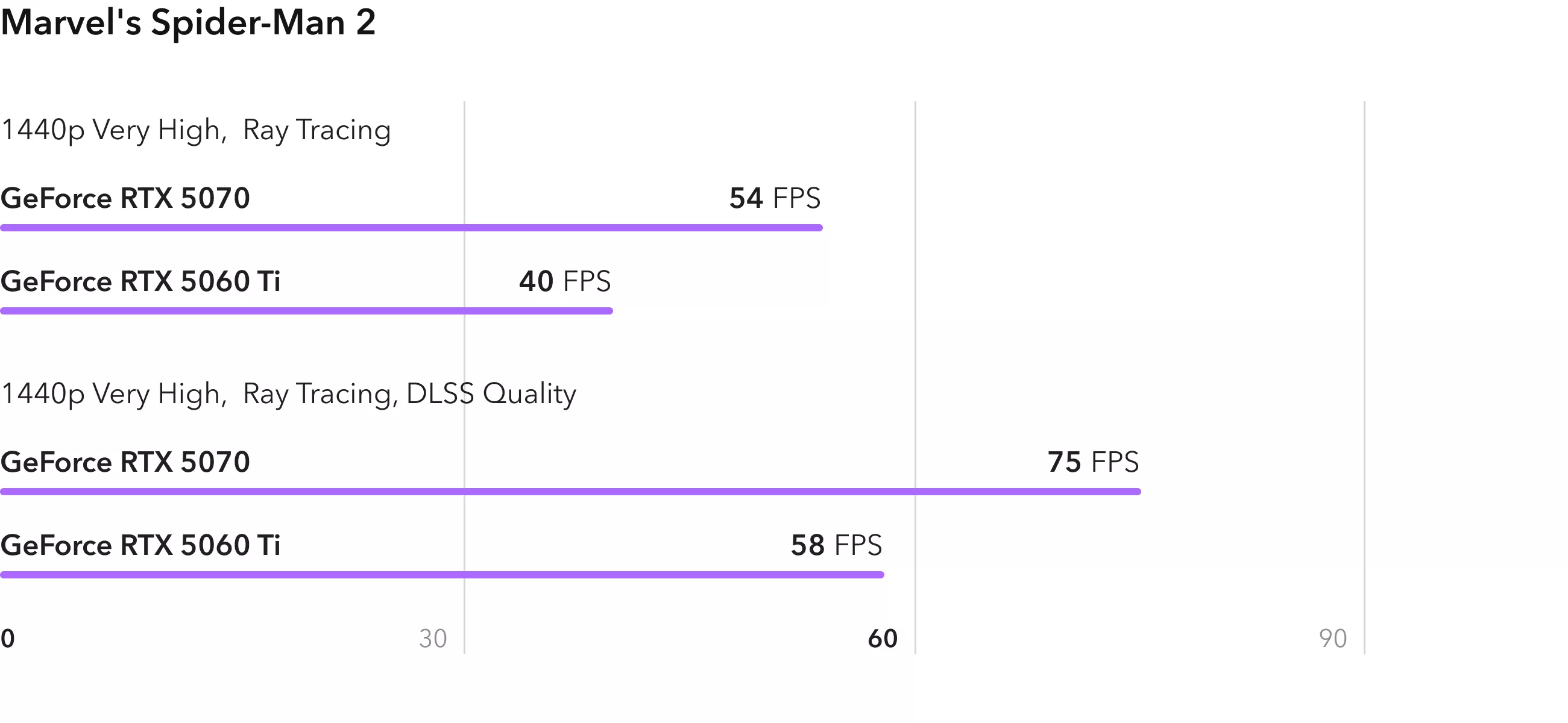 В Marvels Spider-Man 2 повторяется ситуация, что была в Hogwarts Legacy. Результат RTX 5060 Ti с DLSS практически совпадает с показателями RTX 5070 в настоящем 2К разрешении. Однако, при этом младшая карта будет иметь немного более стабильный фреймрейт, так как имеет больший объем видеопамяти, что особенно заметно в длительных игровых сессиях.