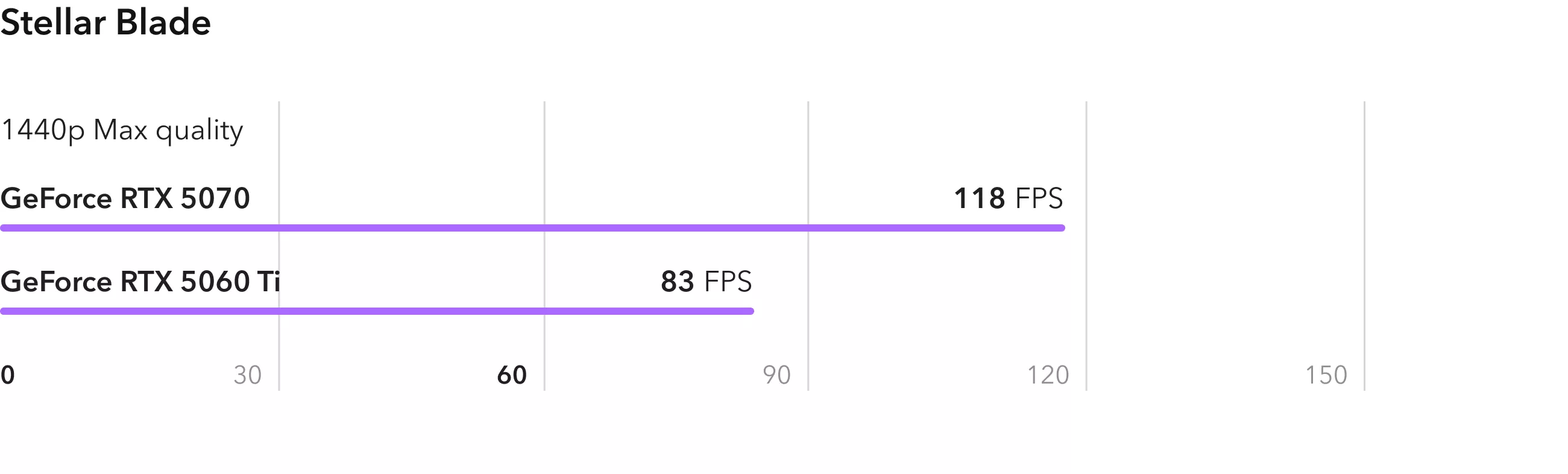 Динамичная экшн игра Stellar Blade работает отлично даже на игровых компьютерах начального уровня. Если же выставить максимальные настройки при разрешении 2К будет достаточно RTX 5060 Ti с ее средним показателем 83 FPS. RTX 5070 снова показывает отличный результат и превосходит младшую видеокарту на 42%.