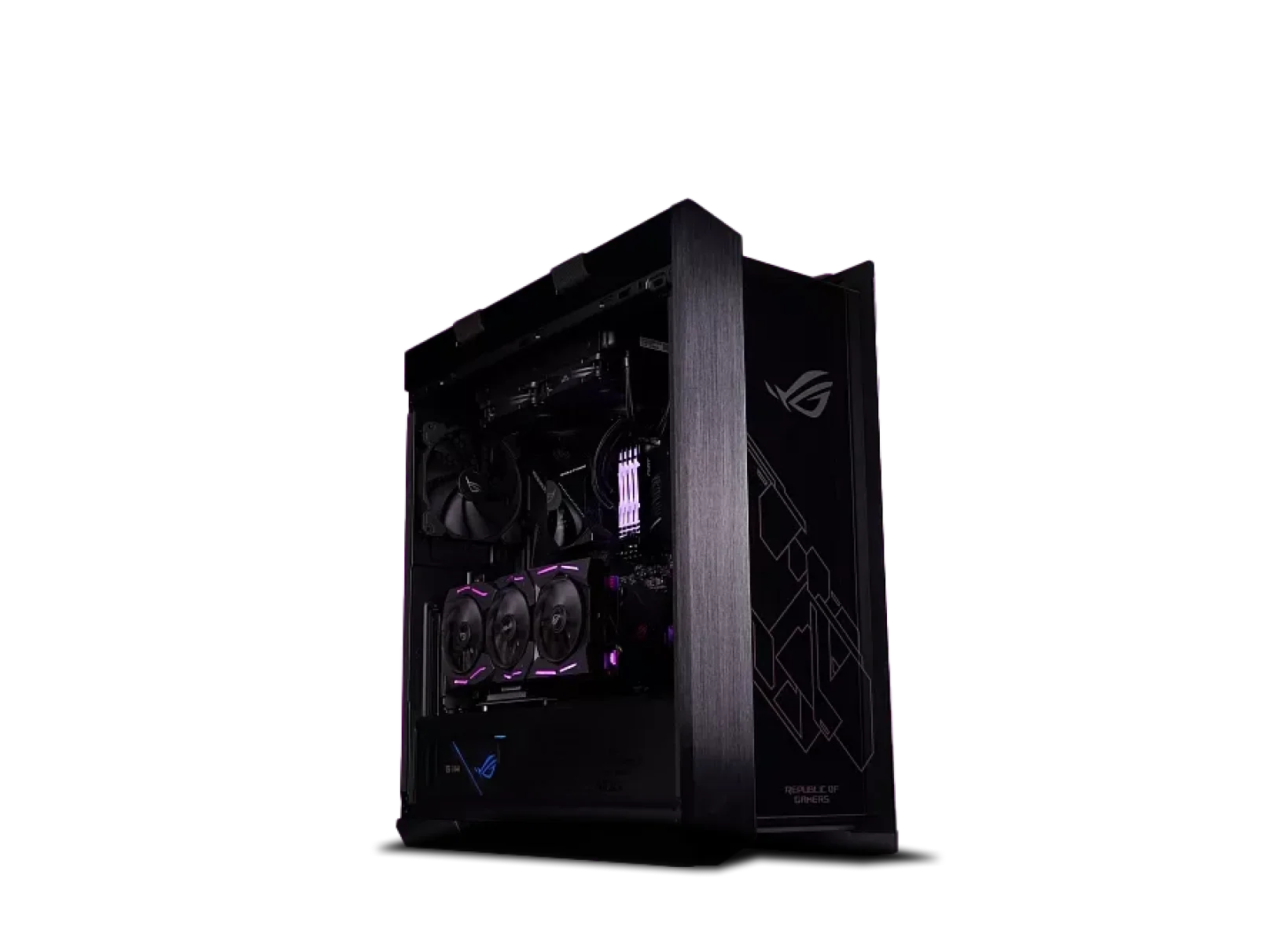 Сборка оформлена в корпусе ASUS ROG Strix Helios — массивном и эффектном шасси с закалённым стеклом и алюминиевыми вставками. Каждая грань отточена в духе ROG: строгая симметрия, аккуратная подсветка и ощущение монолитности.
