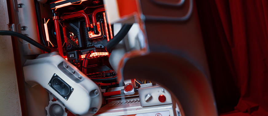 Пламенное сердце и видеокарту ЭЛЕАНОРЫ охлаждают два независимых контура кастомного водяного охлаждения.